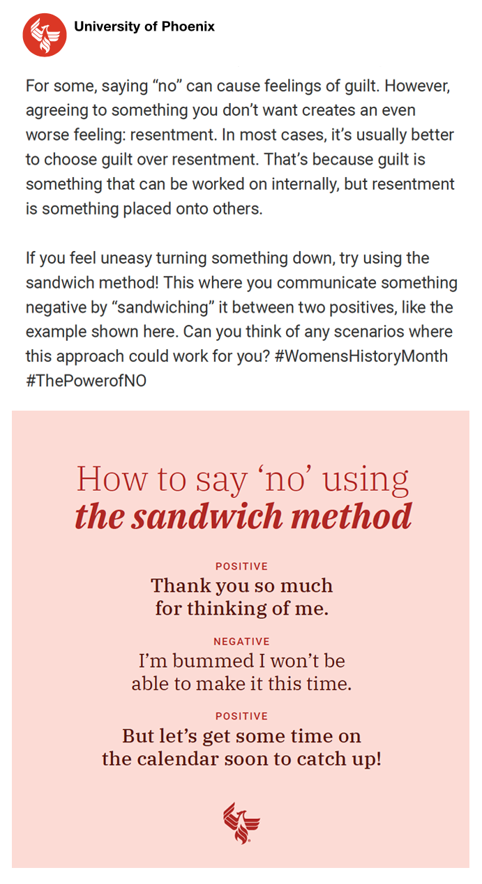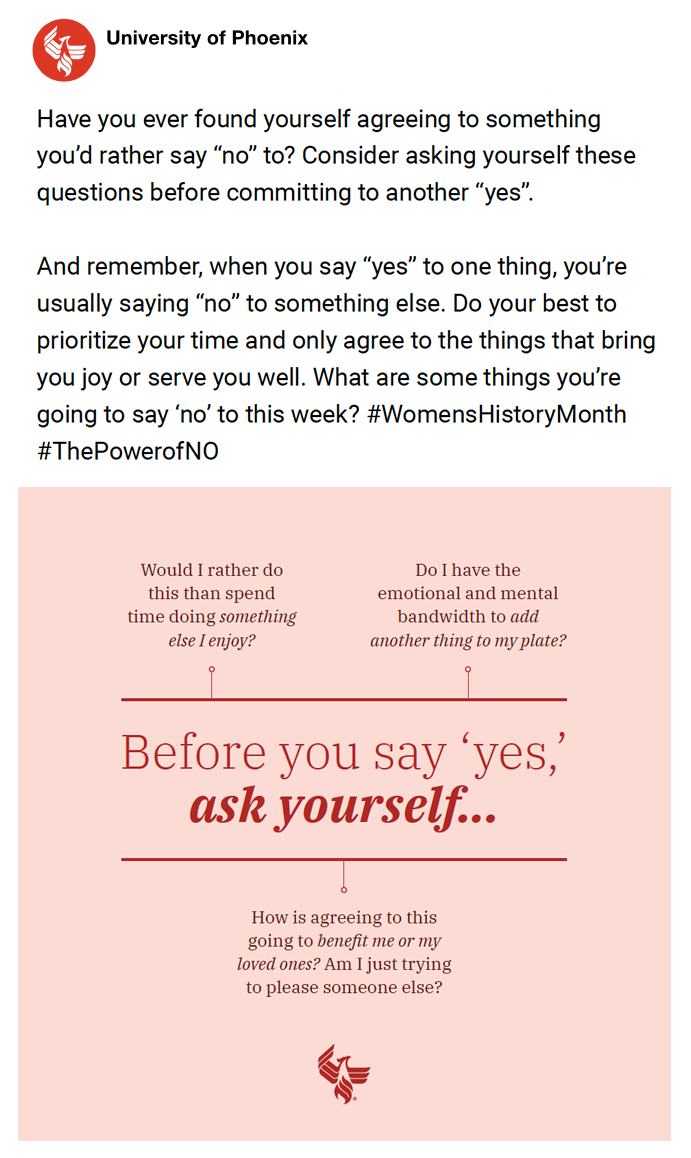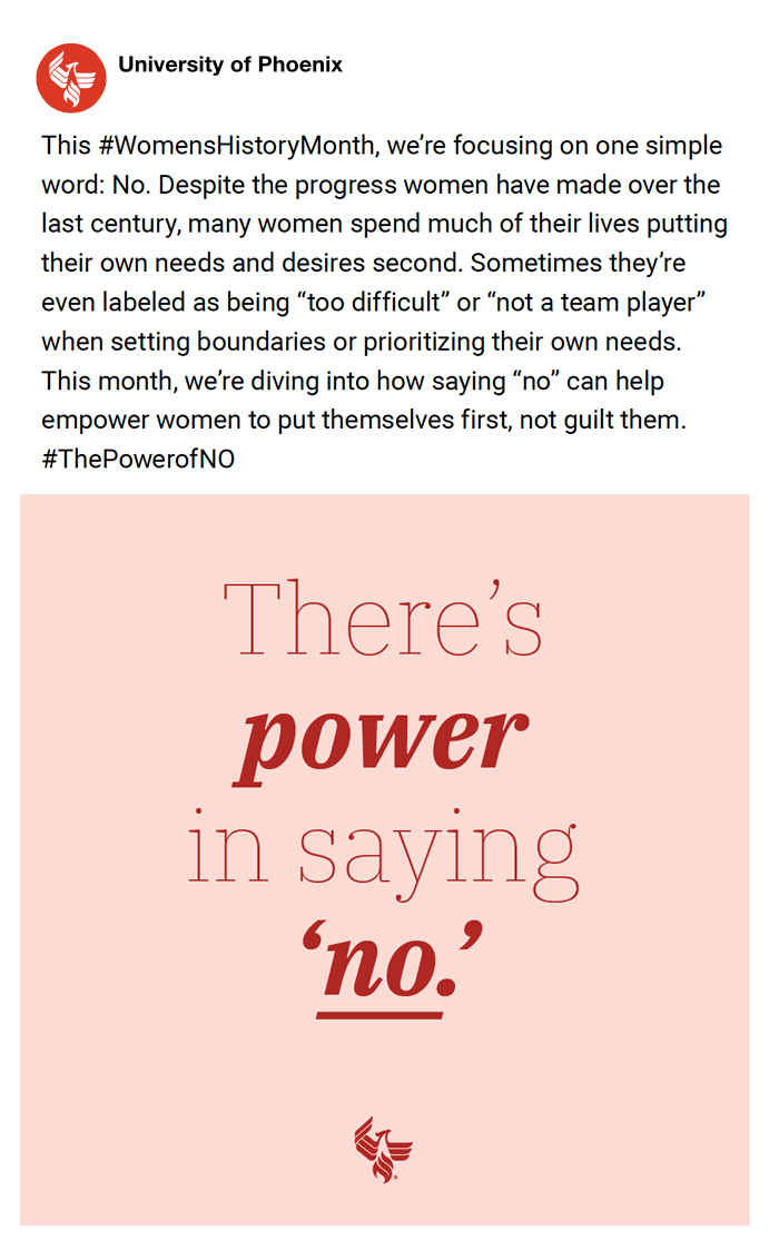 The majority of UOPX’s audience is middle- to lower-socioeconomic-class women. We wanted to meet them where they were this Women’s History month with the assurance that “no” is not a bad word, but an empowering one.